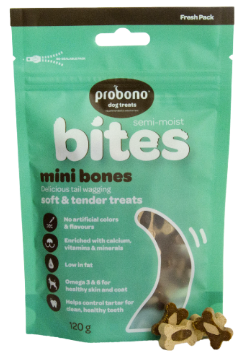 Nourish your dog with Probono Bites, available in a 500g tub or 120g pouches. These soft and tender treats are perfect for all dogs, with added benefits such as no artificial colors or flavors, calcium and vitamins for strong bones, omega 3 and 6 for a healthy coat, and tartar control for clean teeth. Low in fat and suitable for pups from six months old.